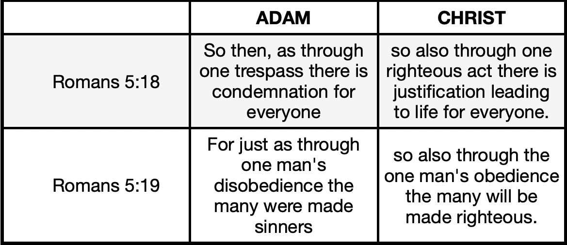 18 So then, as through one trespass there is condemnation for everyone, so also through one righteous act there is justification leading to life for everyone. 19 For just as through one man’s disobedience the many were made sinners, so also through the one man’s obedience the many will be made righteous.